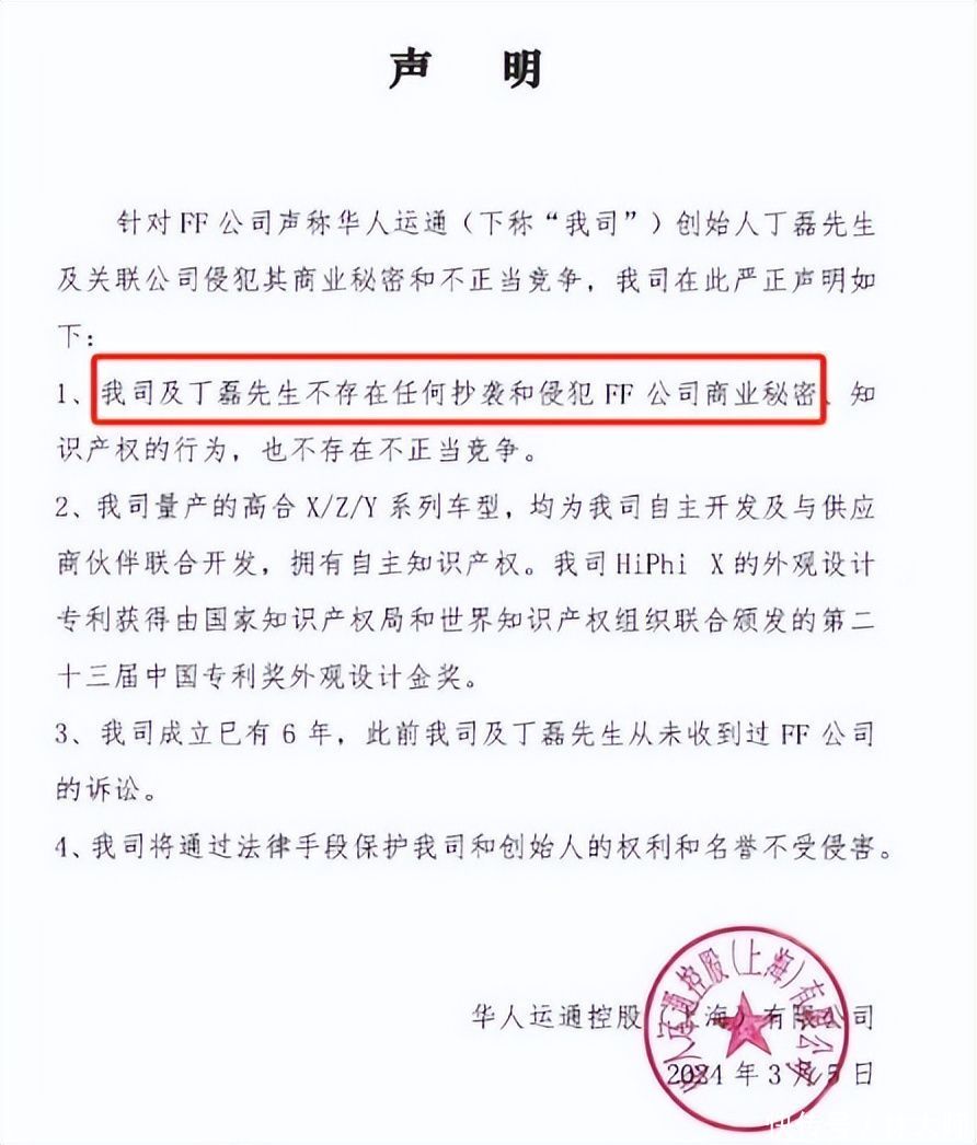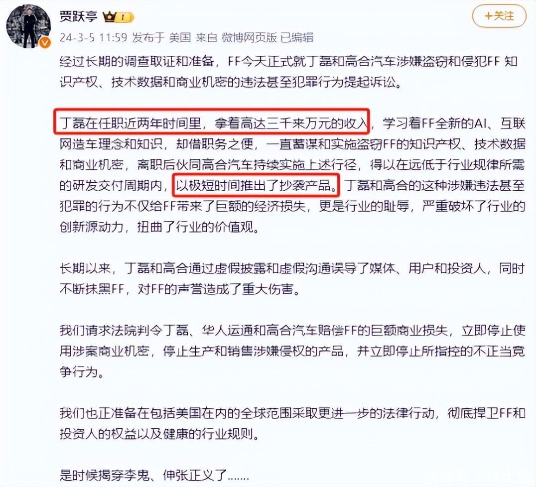 3月5日,贾跃亭和丁磊掀翻剽窃骂战。贾跃亭公设置声,质问高合汽车的丁磊在FF任职2年技艺拿着2千万的收入涉嫌窃取买卖玄妙,短时辰推出抄袭居品,并扬言将给与法律行径。对此,高合汽车速即回话,坚强否定了抄袭和剽窃的指控,并默示将坚强爱戴首创东说念主丁磊的名誉。